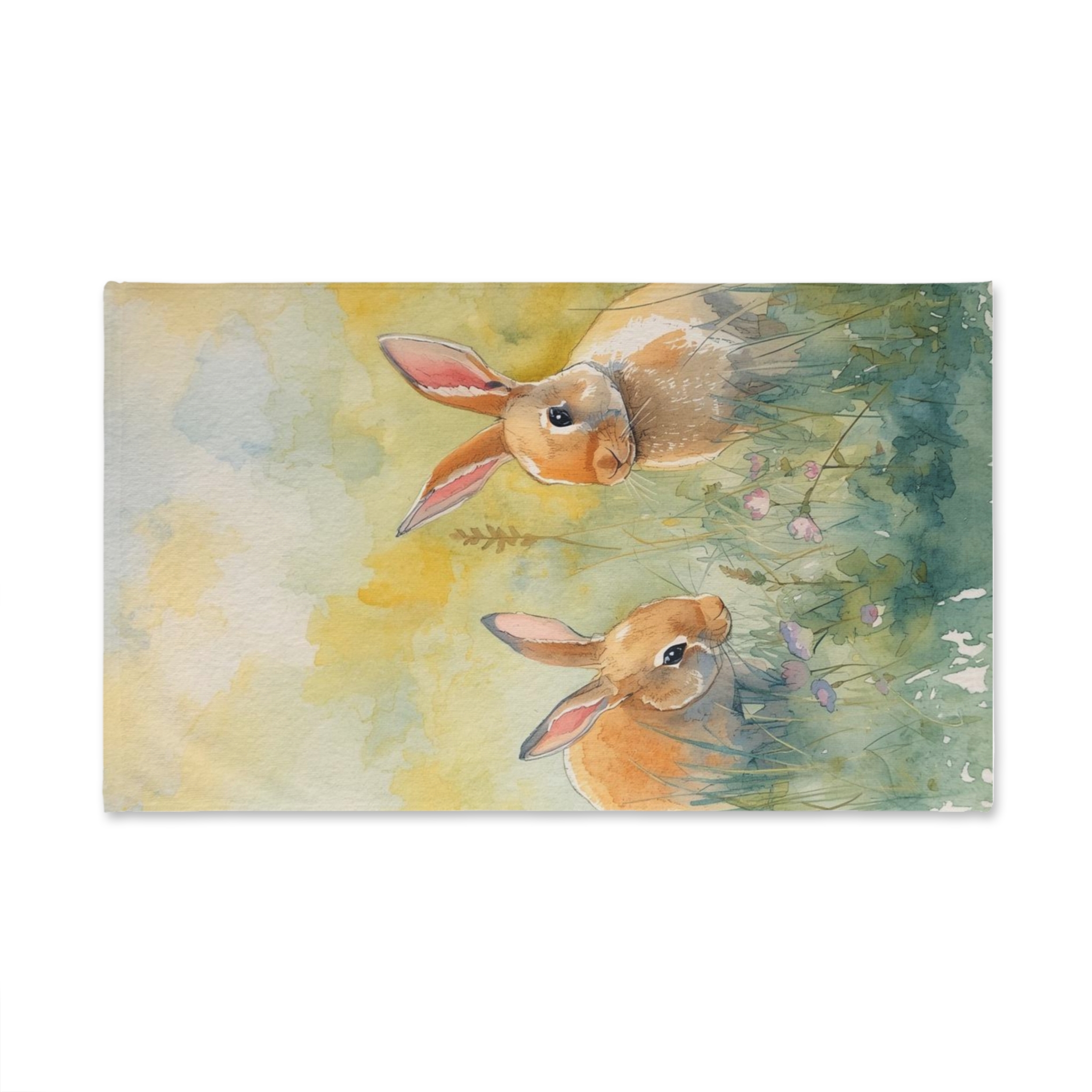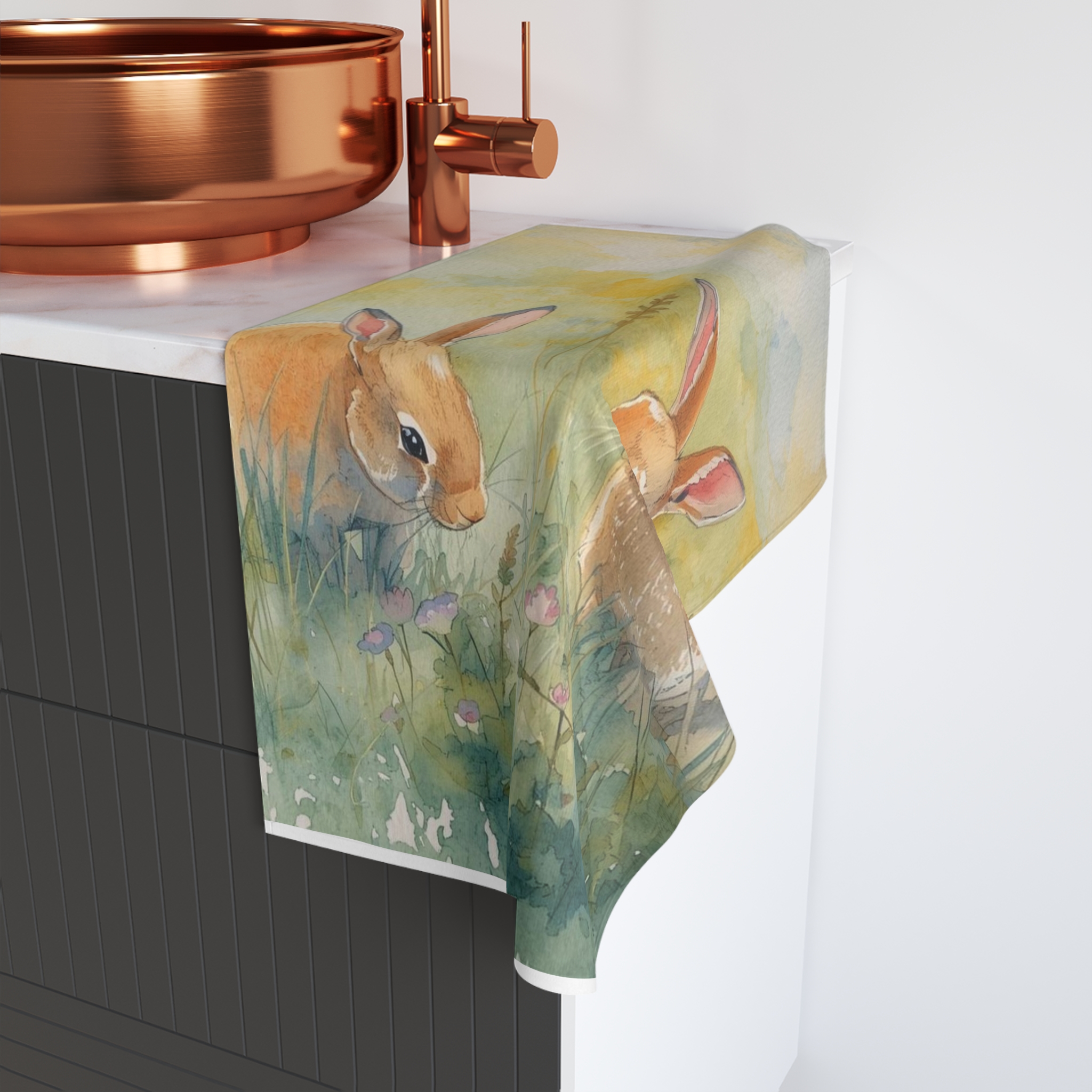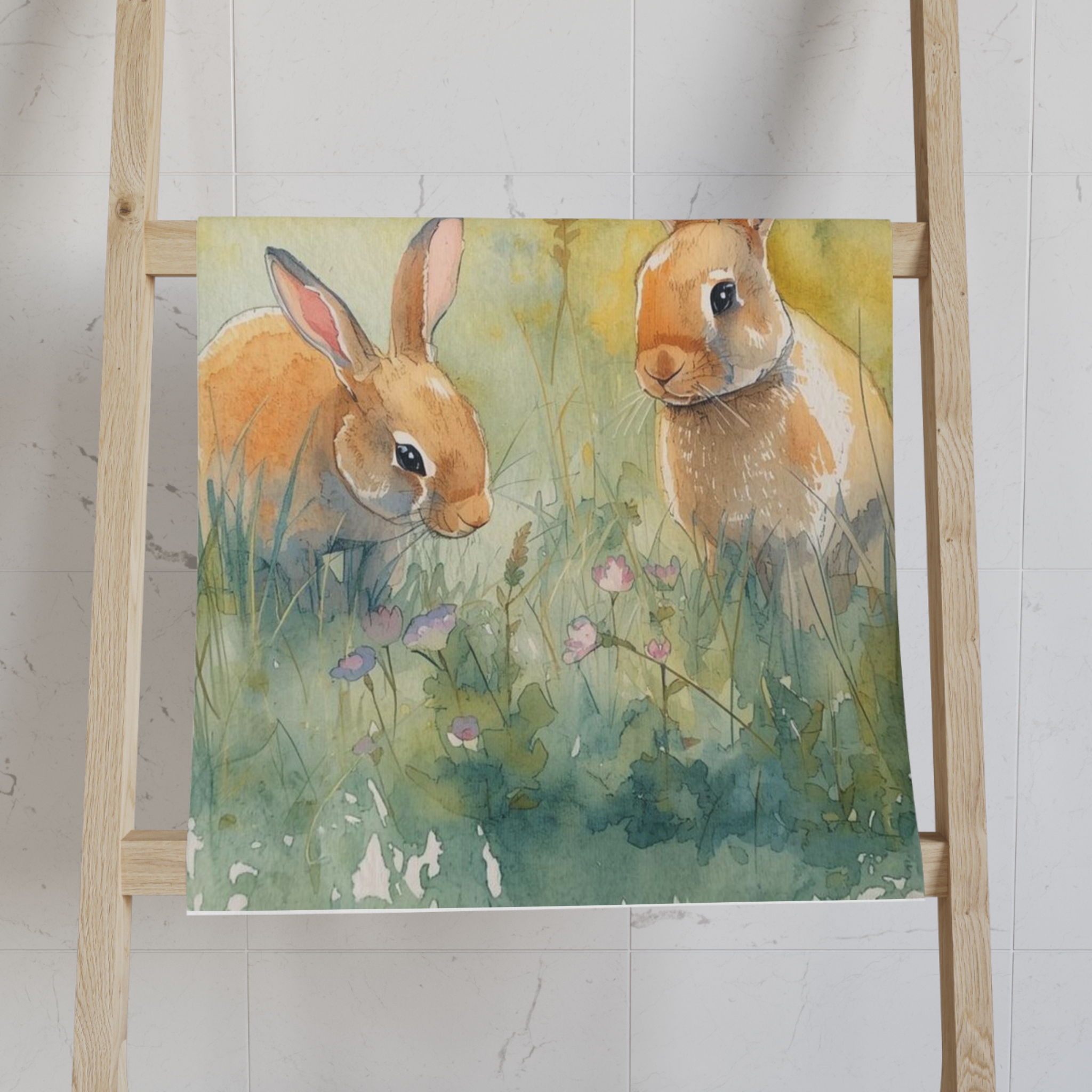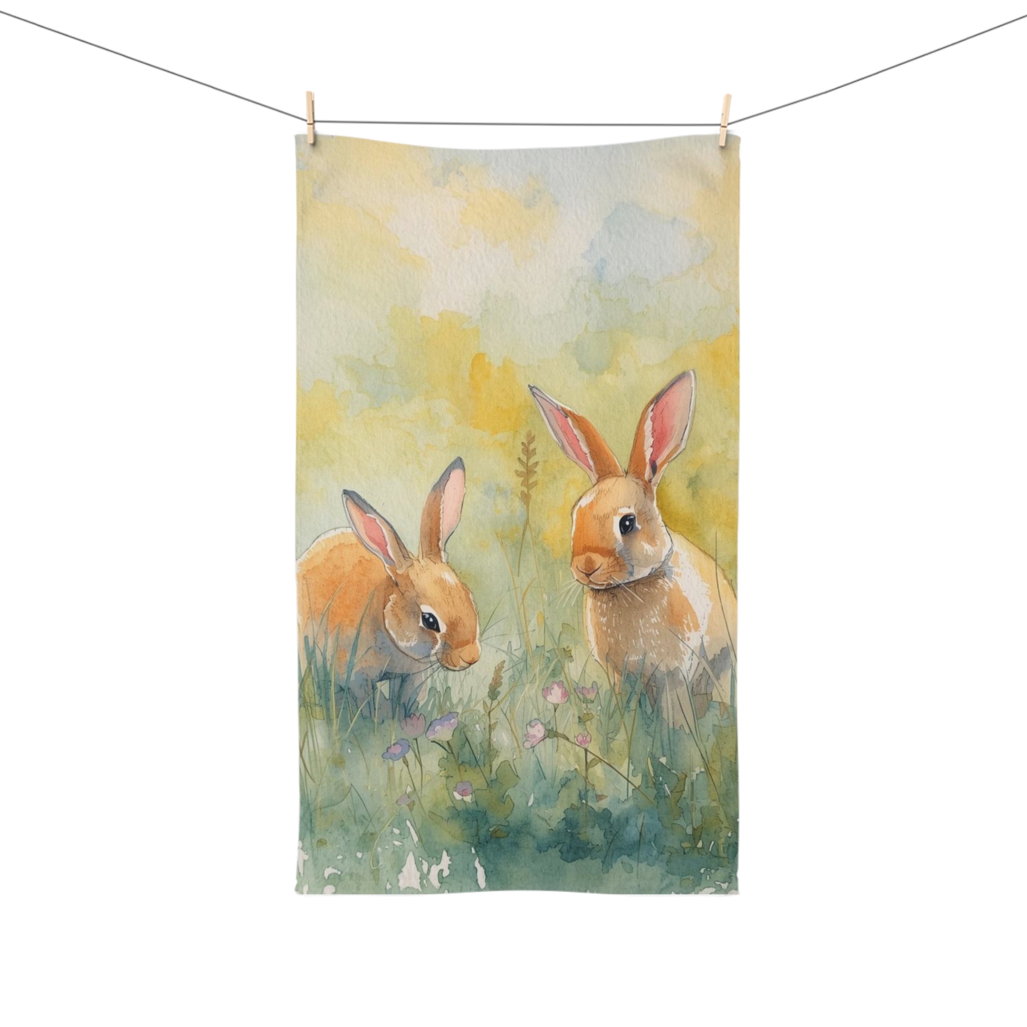 A soft, artful hand towel that brings a quiet meadow into your everyday routine. Gentle watercolor bunnies peek through clover and tall grass, painted in warm honey and sage tones that brighten a sink-side moment without shouting. Lightweight and plush to the touch, this towel soaks up spills and dries quickly, staying shaped and colorful wash after wash. Let it hang in a sunny kitchen, tucked by a cozy bathroom basin, or folded on a guest shelf — it adds a small, soothing pause to the bustle of the day.