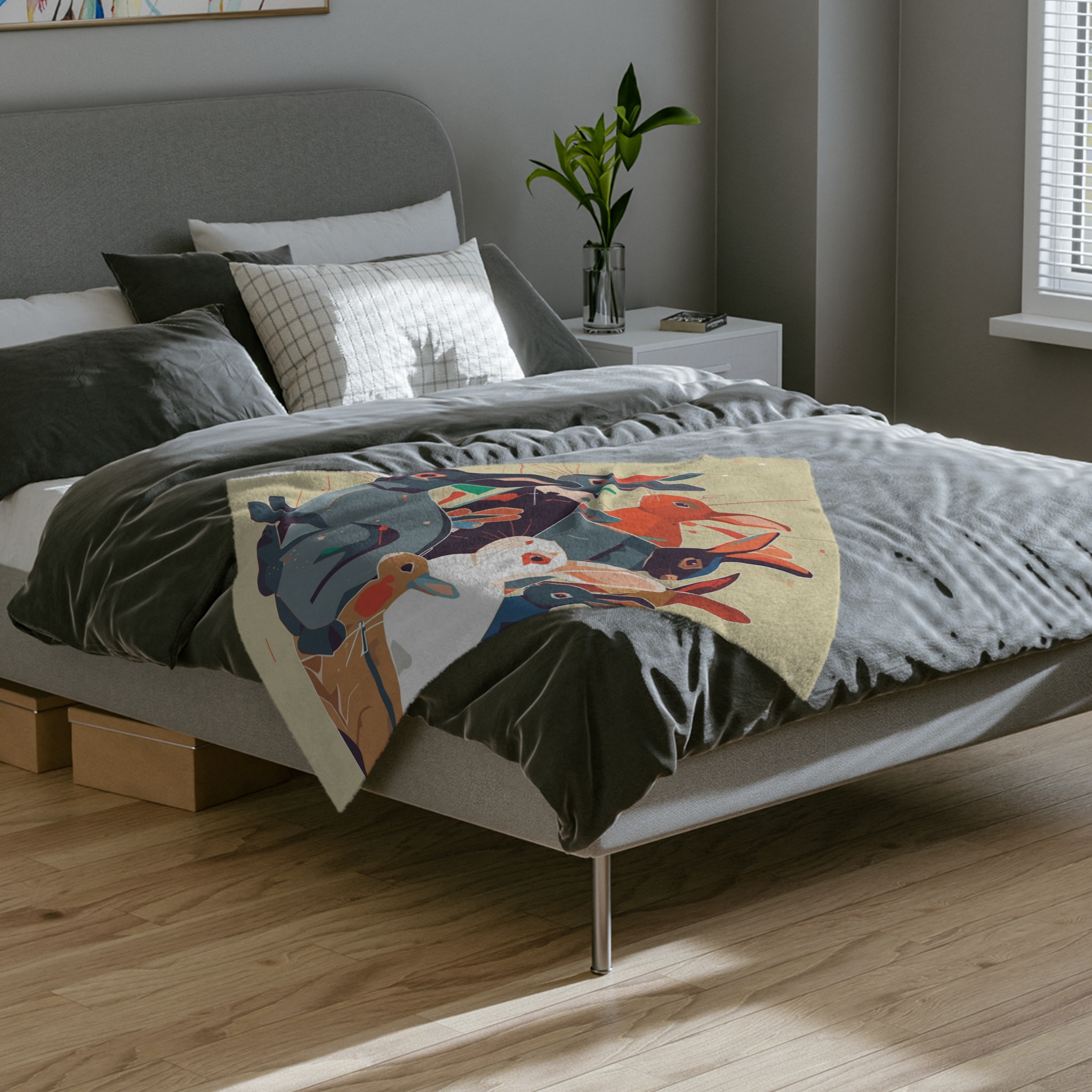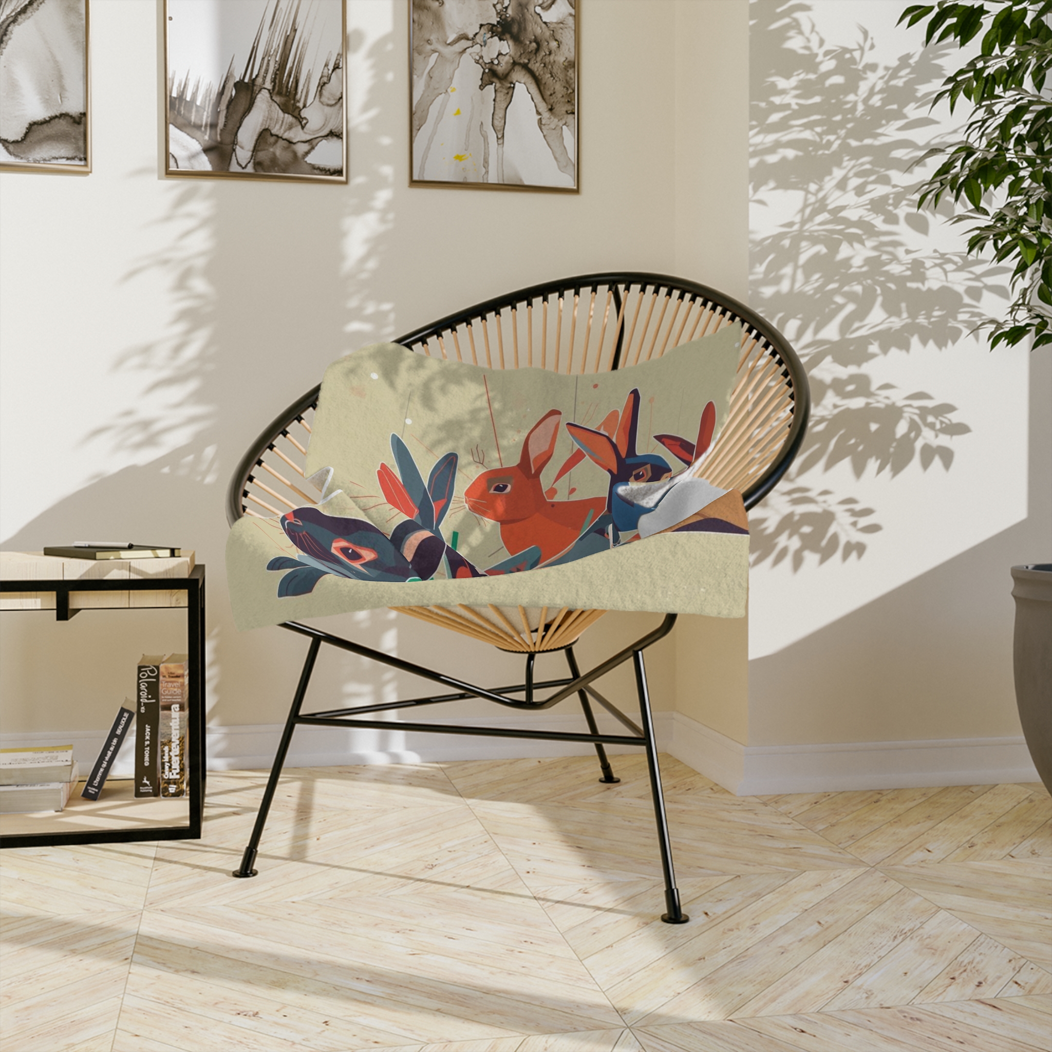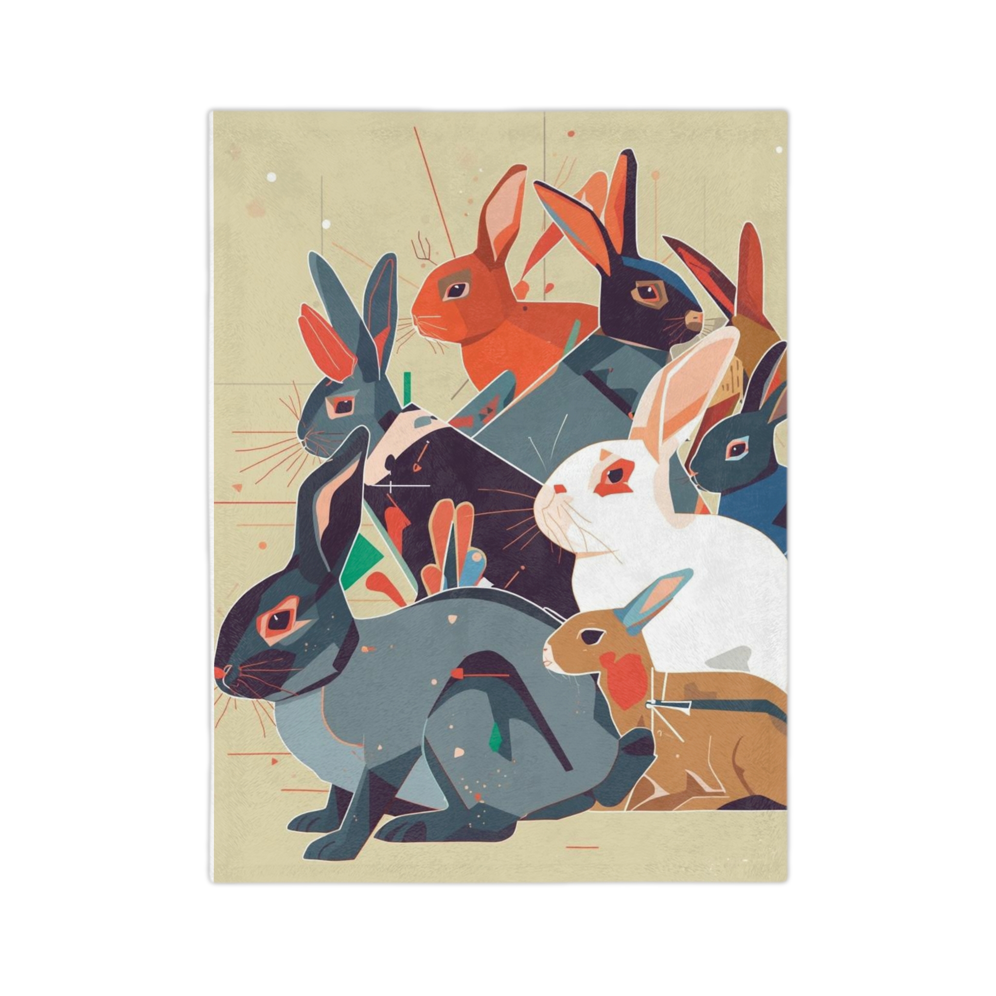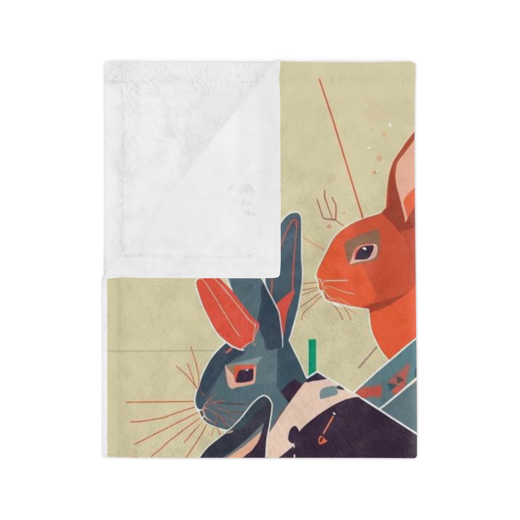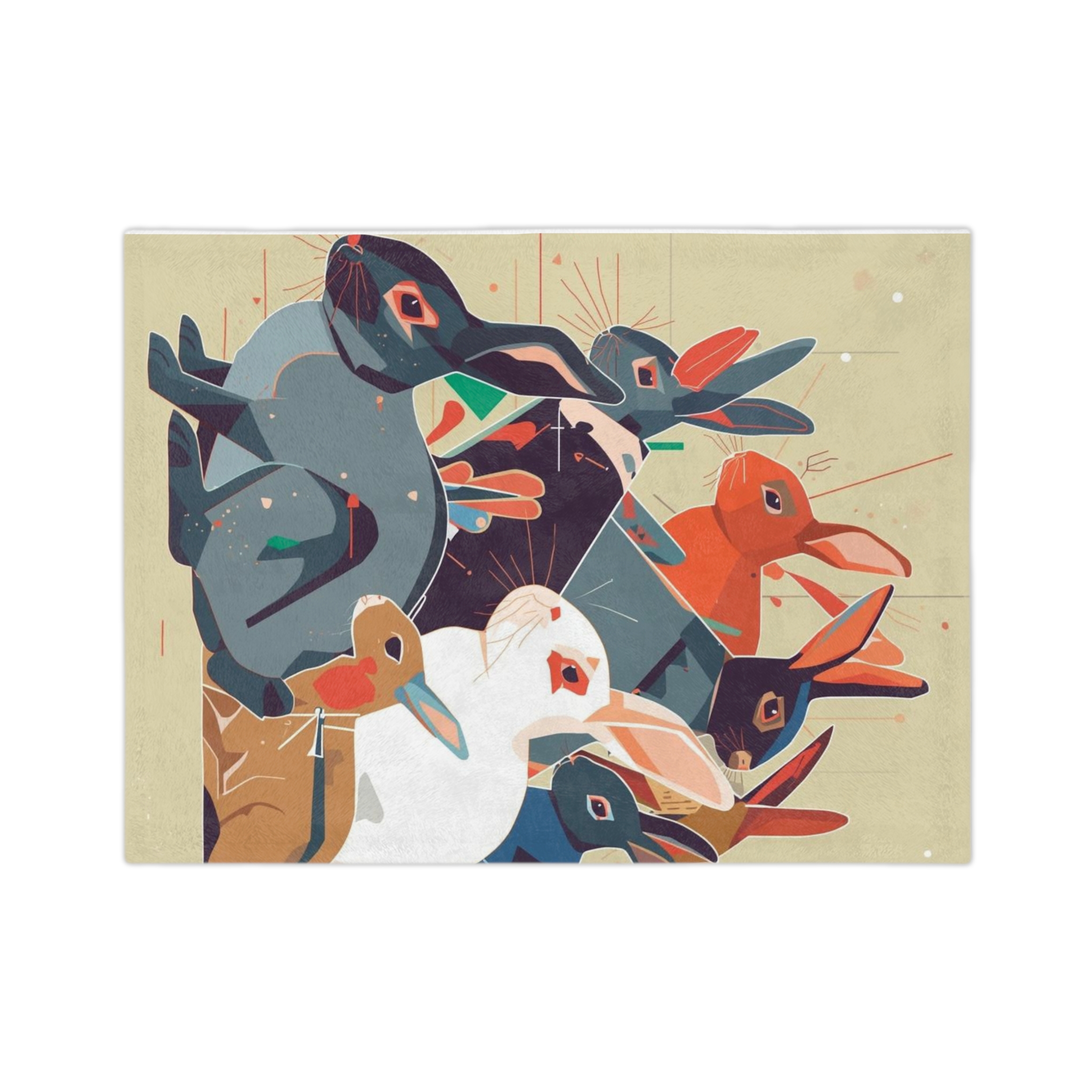 A velvety, art-forward blanket that wraps you in color and calm. The soft plush surface showcases a painterly collage of curious rabbits in warm, vintage-inspired hues — a cozy accent that reads like a small canvas. Tuck it over shoulders on a quiet morning, spread it across a reading chair, or lay it gently at the foot of a bed to add texture and story to your room. Lightweight yet warm, it settles around you without weighty bulk and keeps its vivid printed artwork wash after wash.