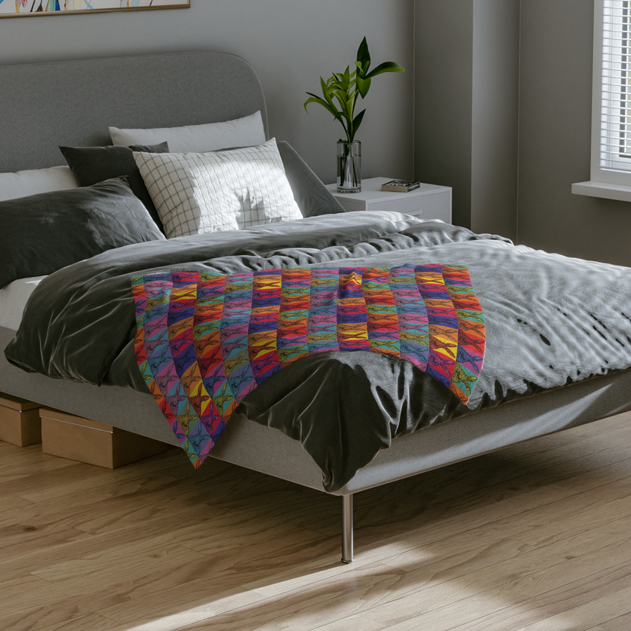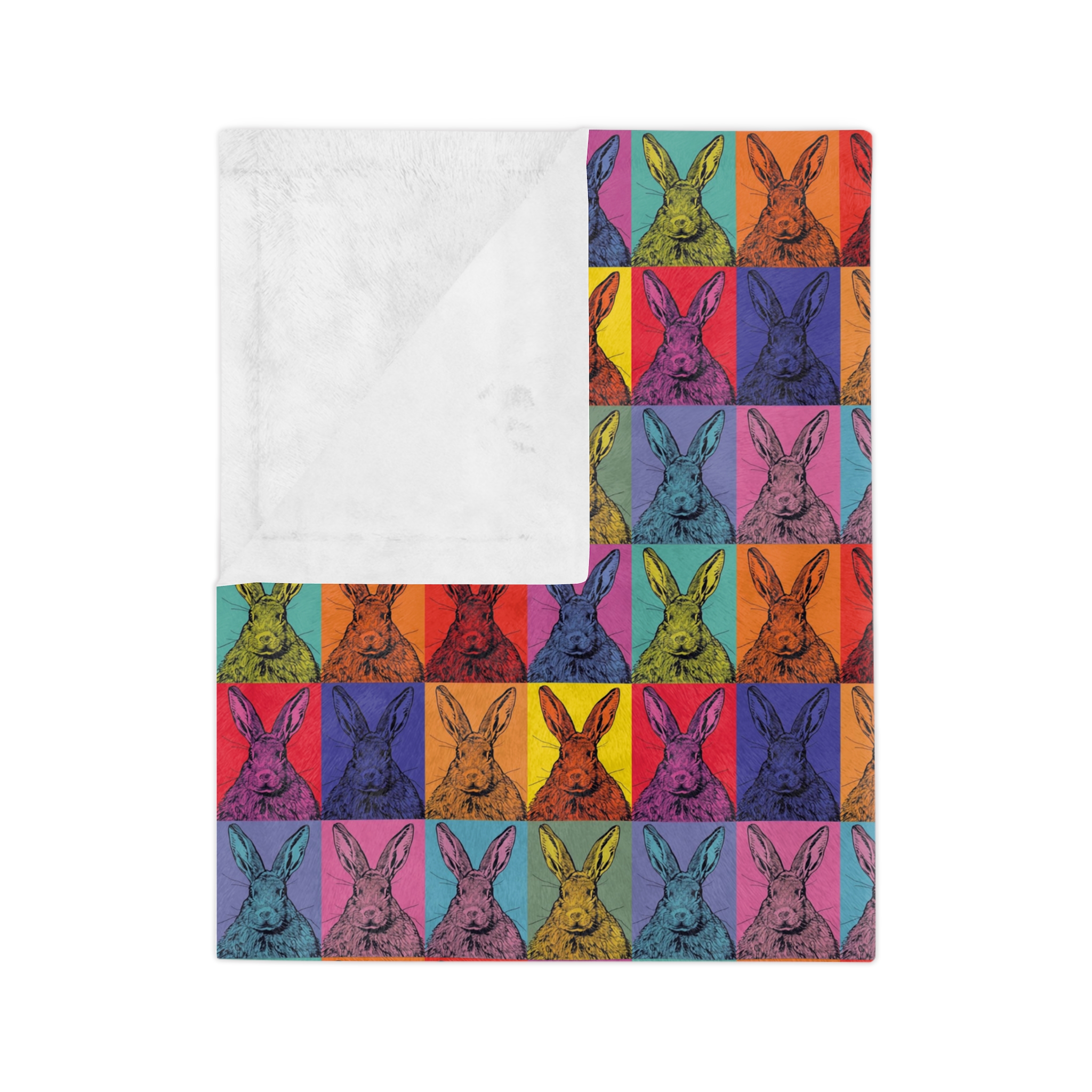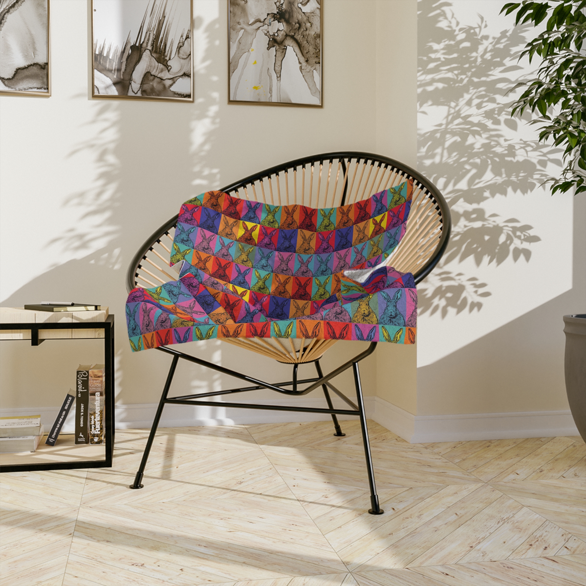 Wrap yourself in a vivid pop of color and cozy comfort. This velveteen microfiber blanket features a tiled, high-contrast pattern of hand-drawn hares in saturated jewel tones — a lively, artful layer that brightens a sofa, reading nook, or camper bunk. The plush, velvety face invites you to sink in after a long day while the durable hem and stitched edge keep it looking neat through repeated use. Lightweight yet warm, it’s easy to toss into a tote or lay across knees for a burst of warmth and personality on chill evenings. The one-sided print keeps the design crisp and bold, while the microfiber finish feels silky against skin.