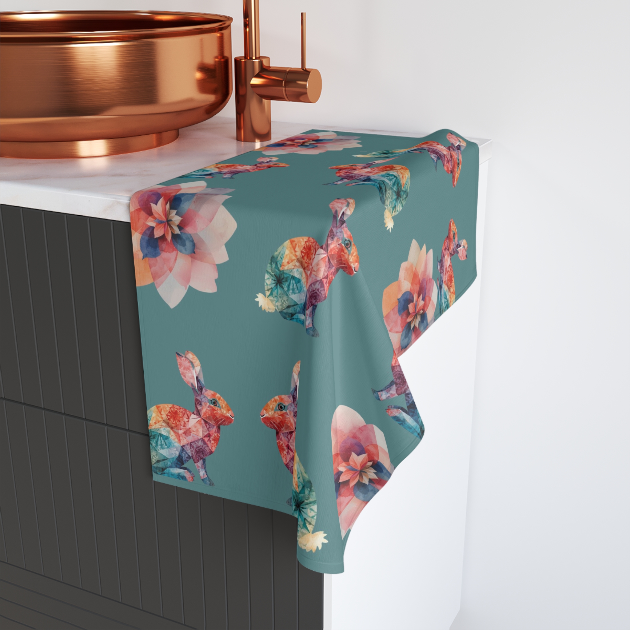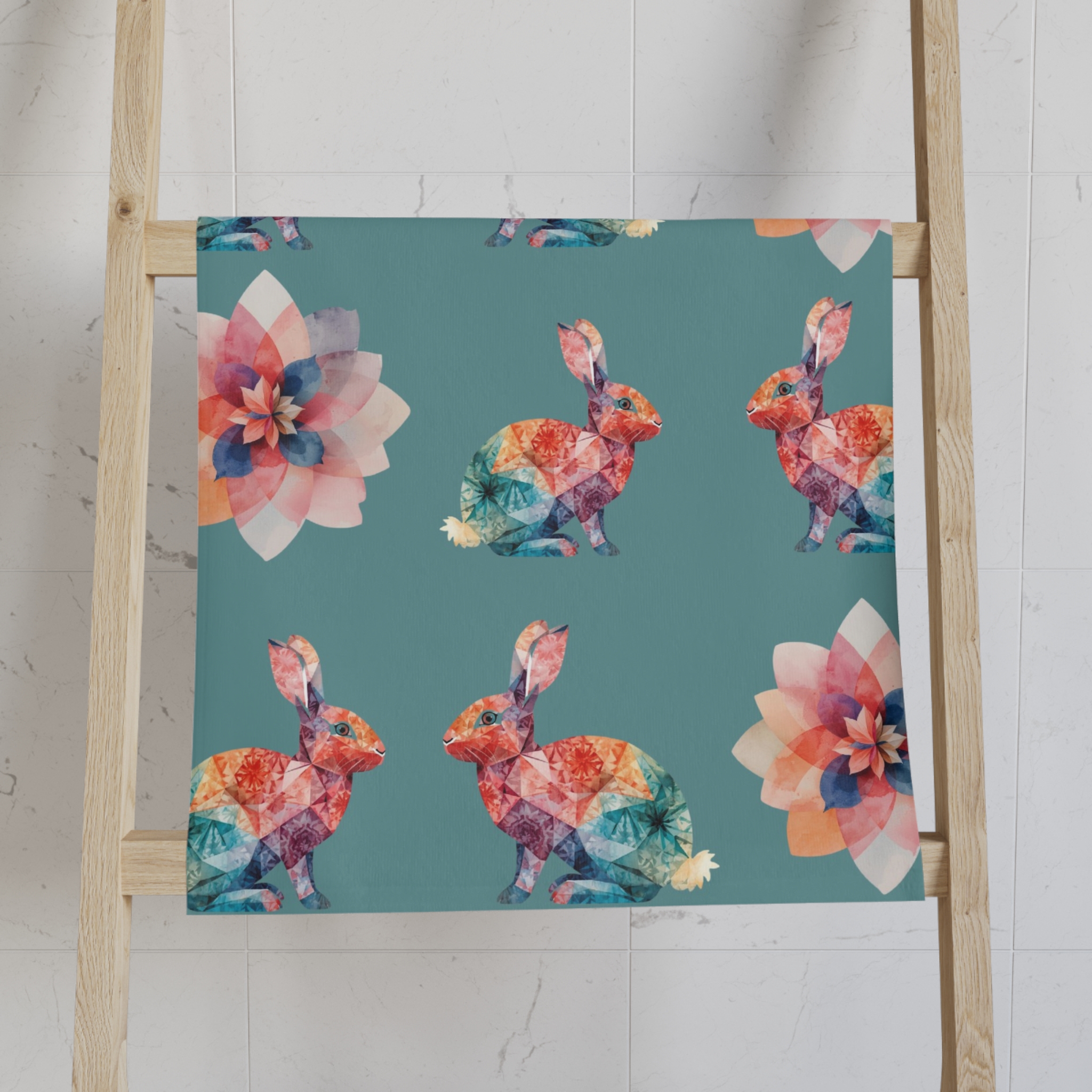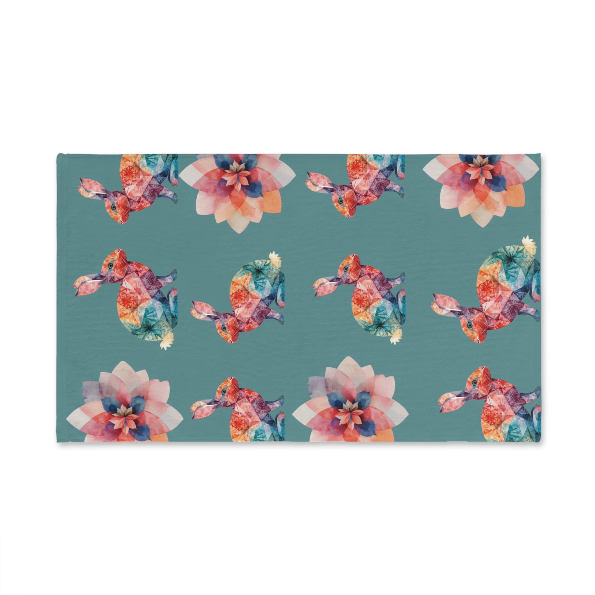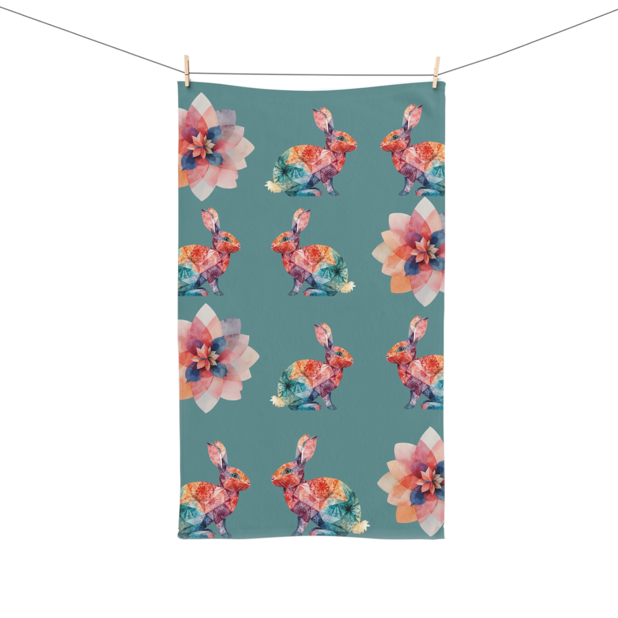 Soft, colorful hand towel that brings a cheerful, artistic touch to everyday moments. Lightweight and plush to the touch, it features watercolor-style rabbits and layered floral mandalas on a muted teal ground. The print’s bright, painterly palette pops against the calm background, turning a simple towel into a small statement piece for the kitchen, powder room, or craft space. Easy to toss in the laundry and quick to dry, it feels gentle on skin and stands up to daily use while keeping its vibrant look.