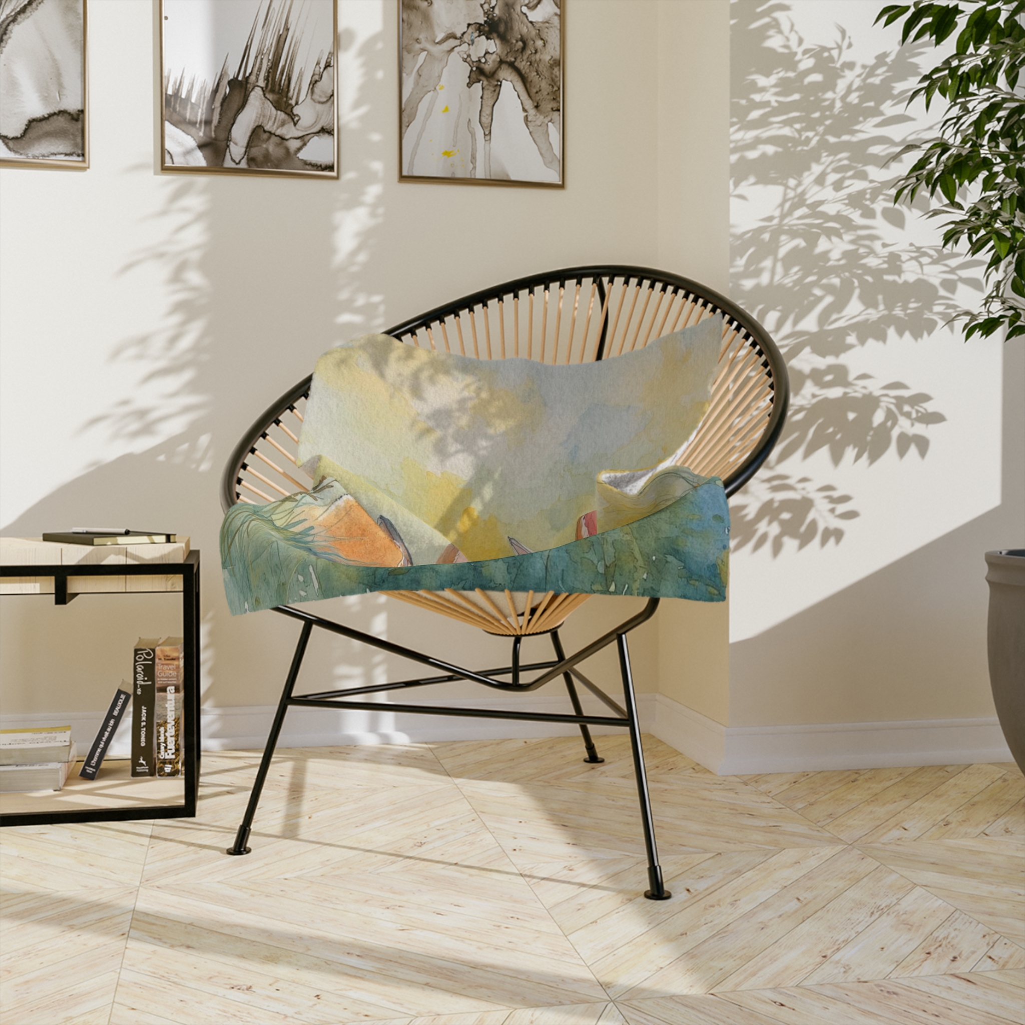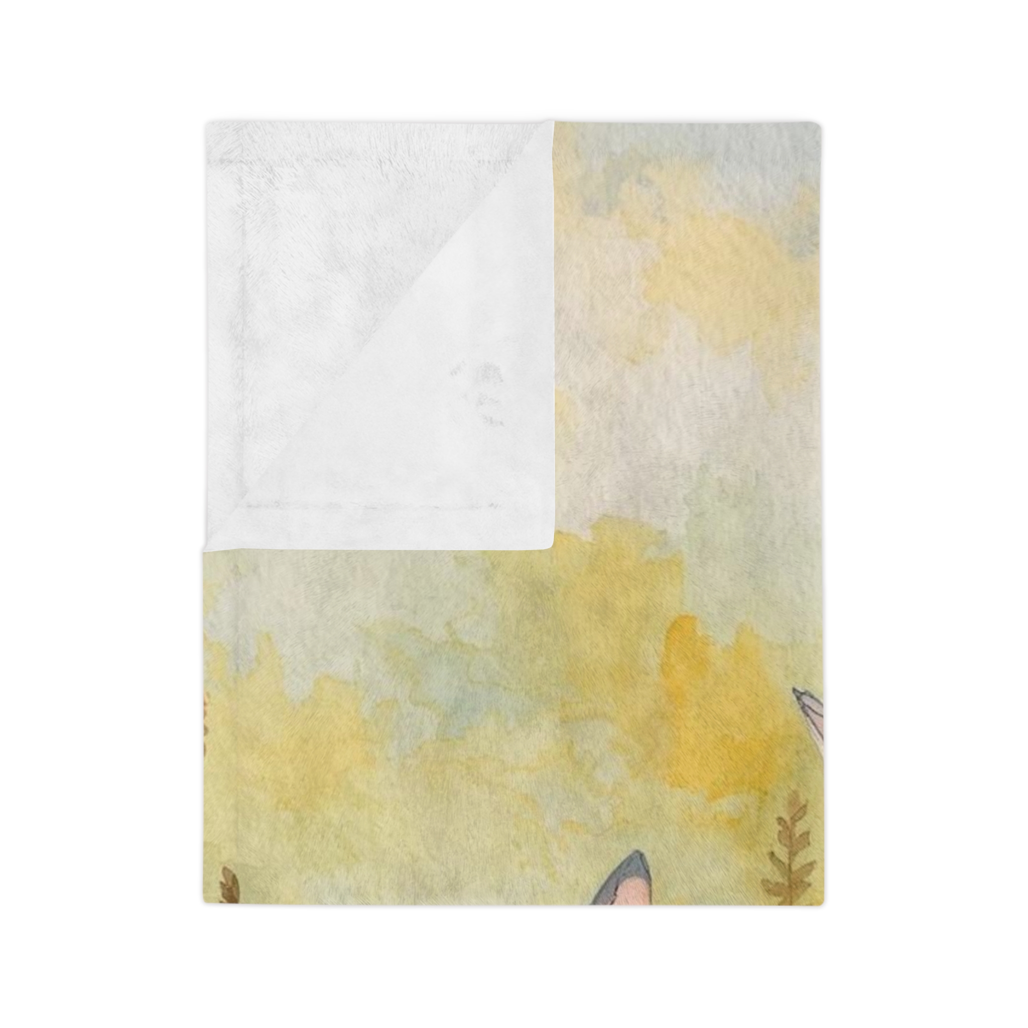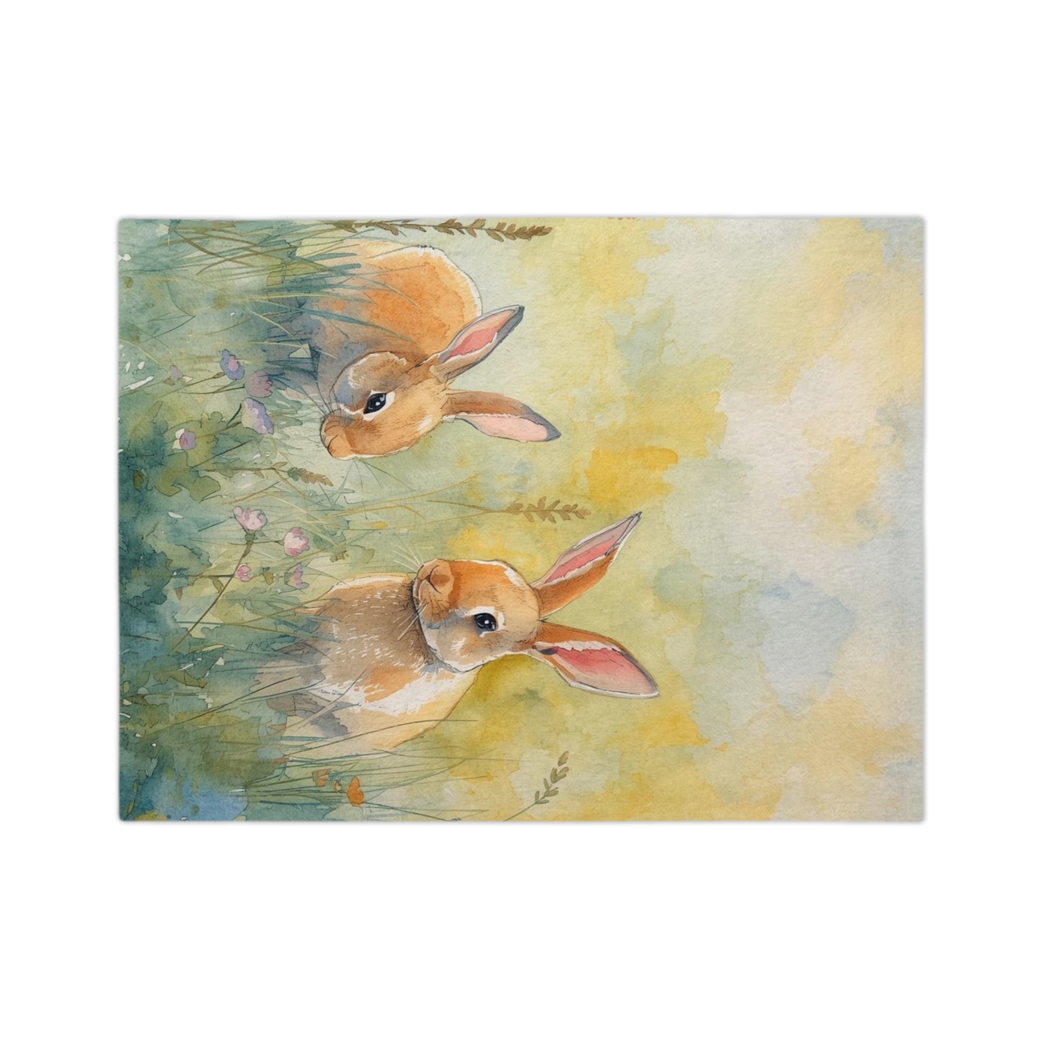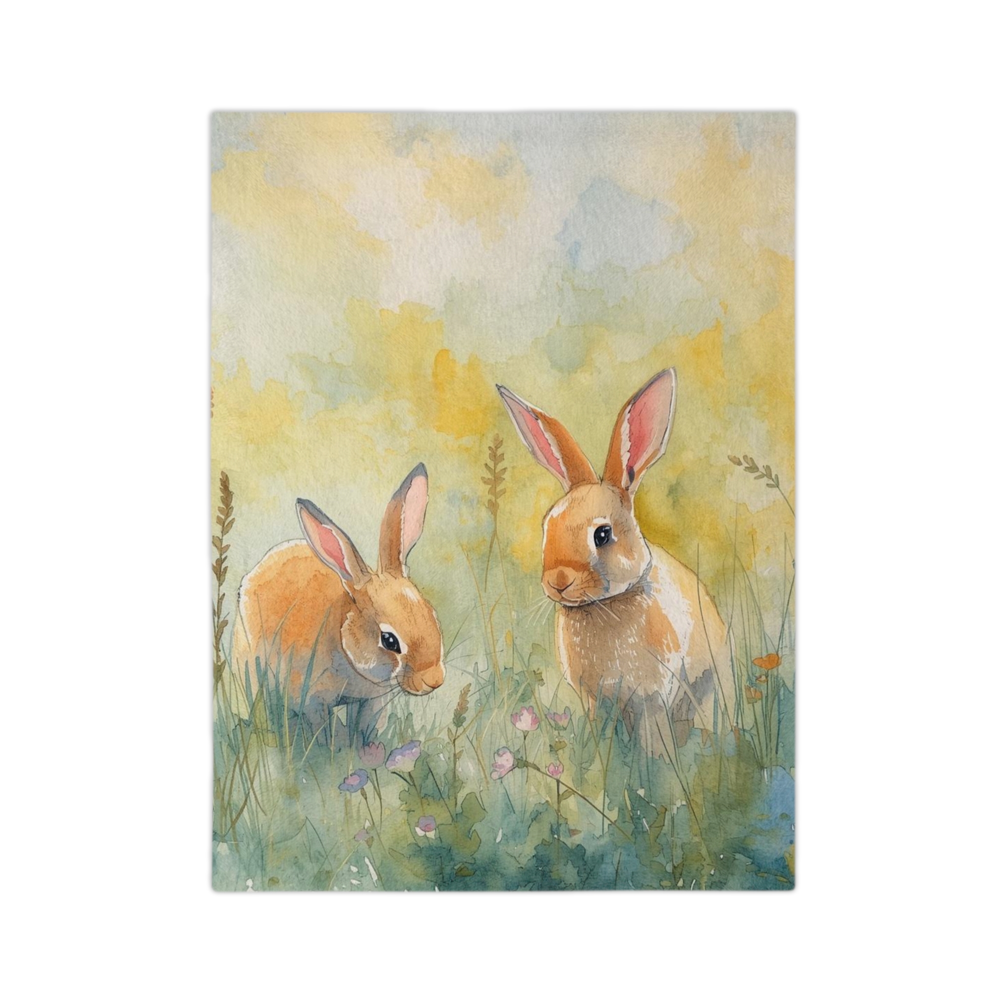 Wrap yourself in a gentle, storybook moment — a plush velveteen microfiber blanket printed with a soft watercolor scene of two curious bunnies in a sunlit meadow. The one-sided print captures warm golden tones and delicate floral details that feel like a quiet morning in spring. Lightweight yet luxuriously plush, this blanket layers easily on a sofa, nursery rocker, or reading nook. It’s made to be touched often: the fabric holds color beautifully and keeps its fluffy texture wash after wash, making it a comforting presence during nap time, story hour, or slow weekend mornings.